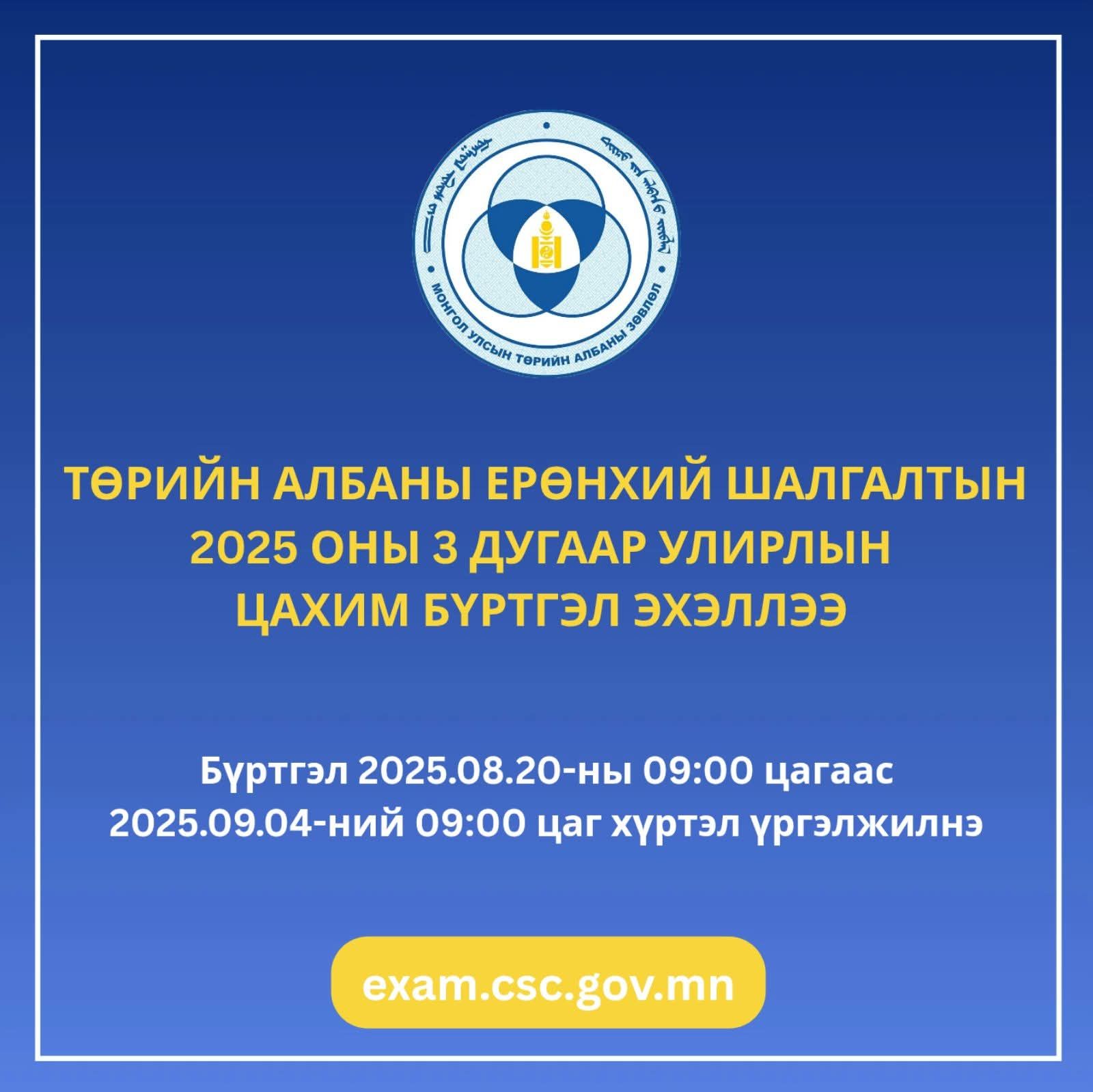 Төрийн албаны 2025 оны 3 дугаар улирлын ерөнхий шалгалтын цахим бүртгэл 8 дугаар сарын 20-ны өдрийн 09:00 цагаас 9 дүгээр сарын 04-ний өдрийн 09:00 цаг хүртэл Төрийн албаны зөвлөлийн https://exam.csc.gov.mn/ цахим хуудсаар явагдана.